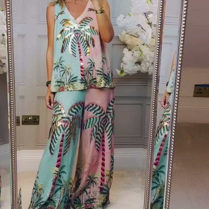 EASY-TO-WEAR TWO-PIECE SET – The Coconut Tree Print Tank & Pants Set is a complete outfit in one. There’s no need to search for matching pieces. The contrasting colors of pink and blue add an extra pop.