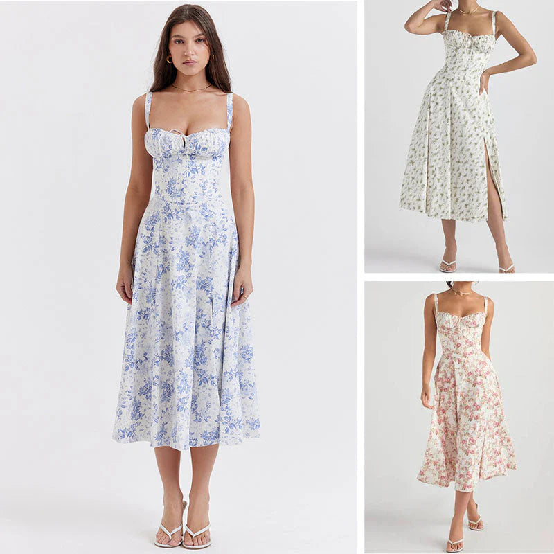 This tight-fitting printed sundress features an eye-catching colourful print that adds fun and flair to your wardrobe. Perfect for spring and summer garden parties, this dress is perfect for spring and summer parties. Add a touch of freshness to your garden party look with this short sundress featuring a lace-up heart-shaped lace-up fastening, a lace-up back, and an exposed thigh-high slit.