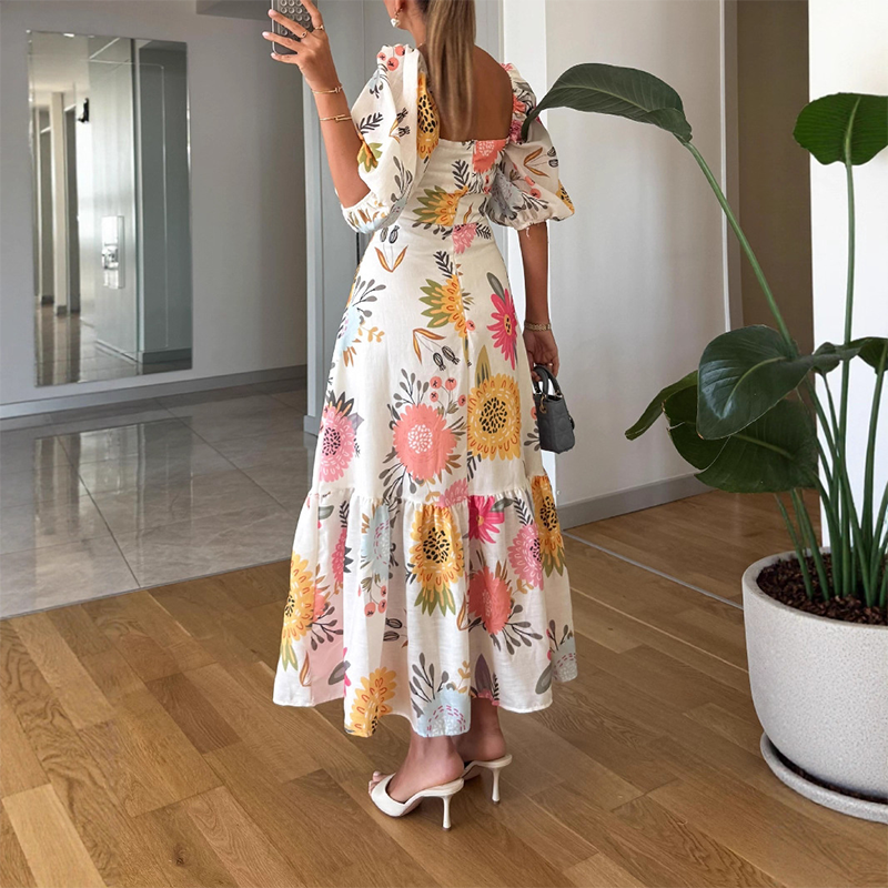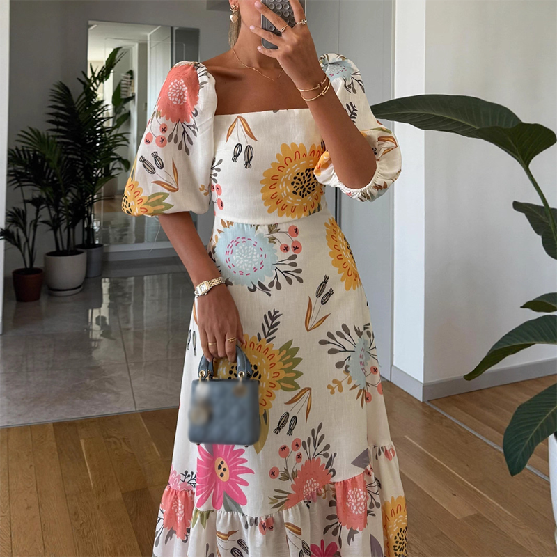 1 * Square Neck Waist-Cinching Printed Dress with Puff Sleeves