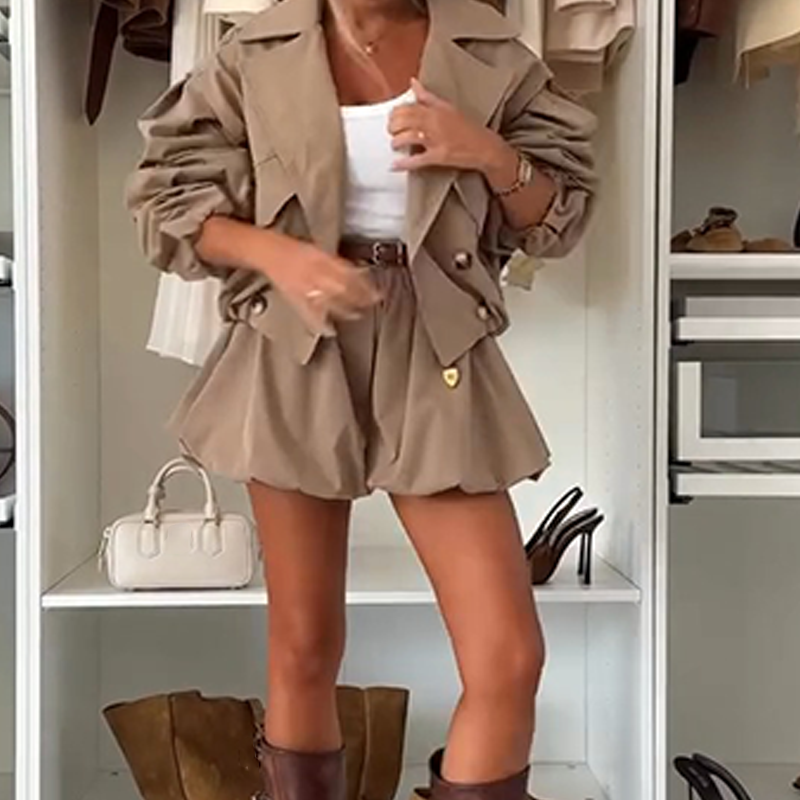 CHIC TWO-PIECE SET: This coordinated outfit includes a short trench-style jacket and matching shorts, offering a complete and stylish ensemble. It presents a cohesive look for various casual or semi-casual settings.