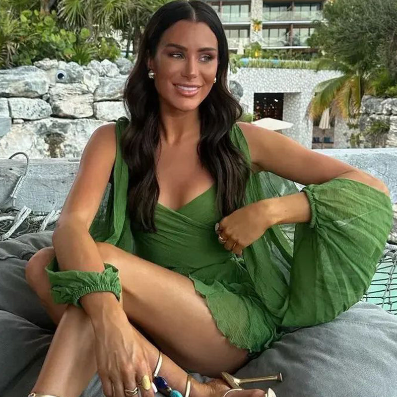 SPLIT SLEEVES: The dress showcases split sleeves, adding a unique and trendy detail to the design. The split sleeves provide a graceful flow and allow for easy movement, enhancing the overall charm of the dress.